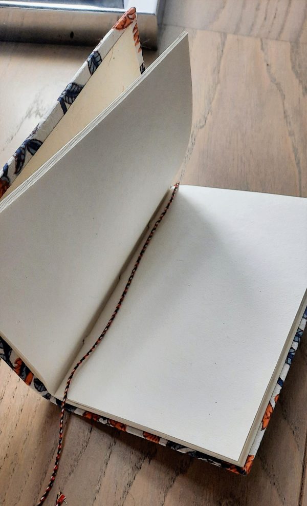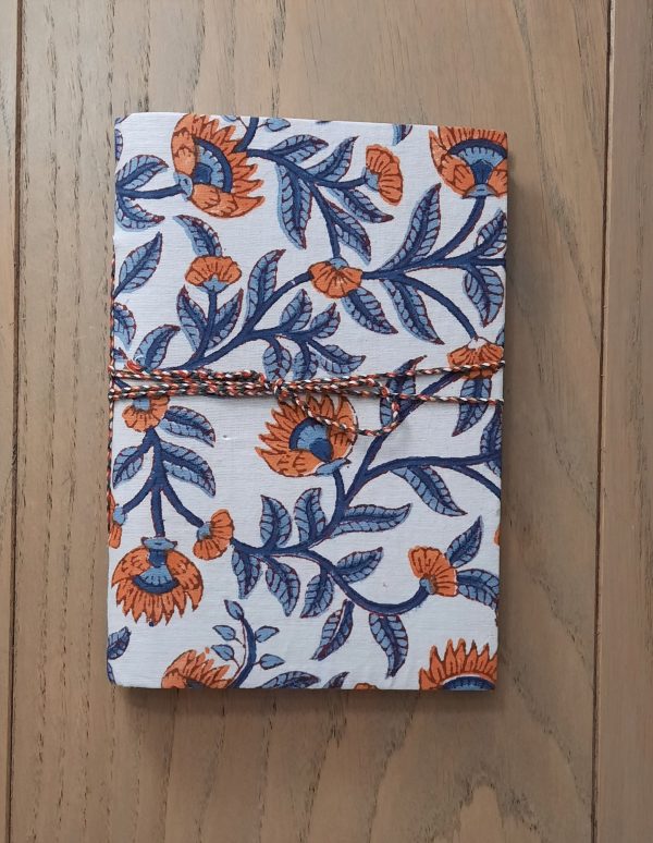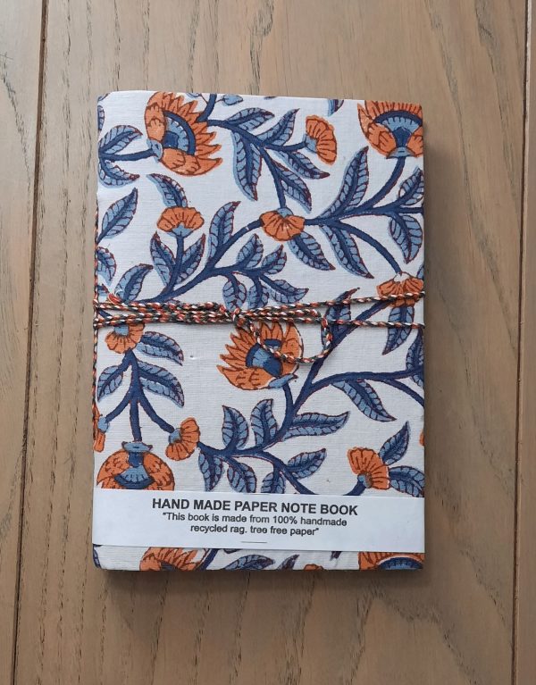 A handmade paper notebook with a beautiful floral graphic on the front.