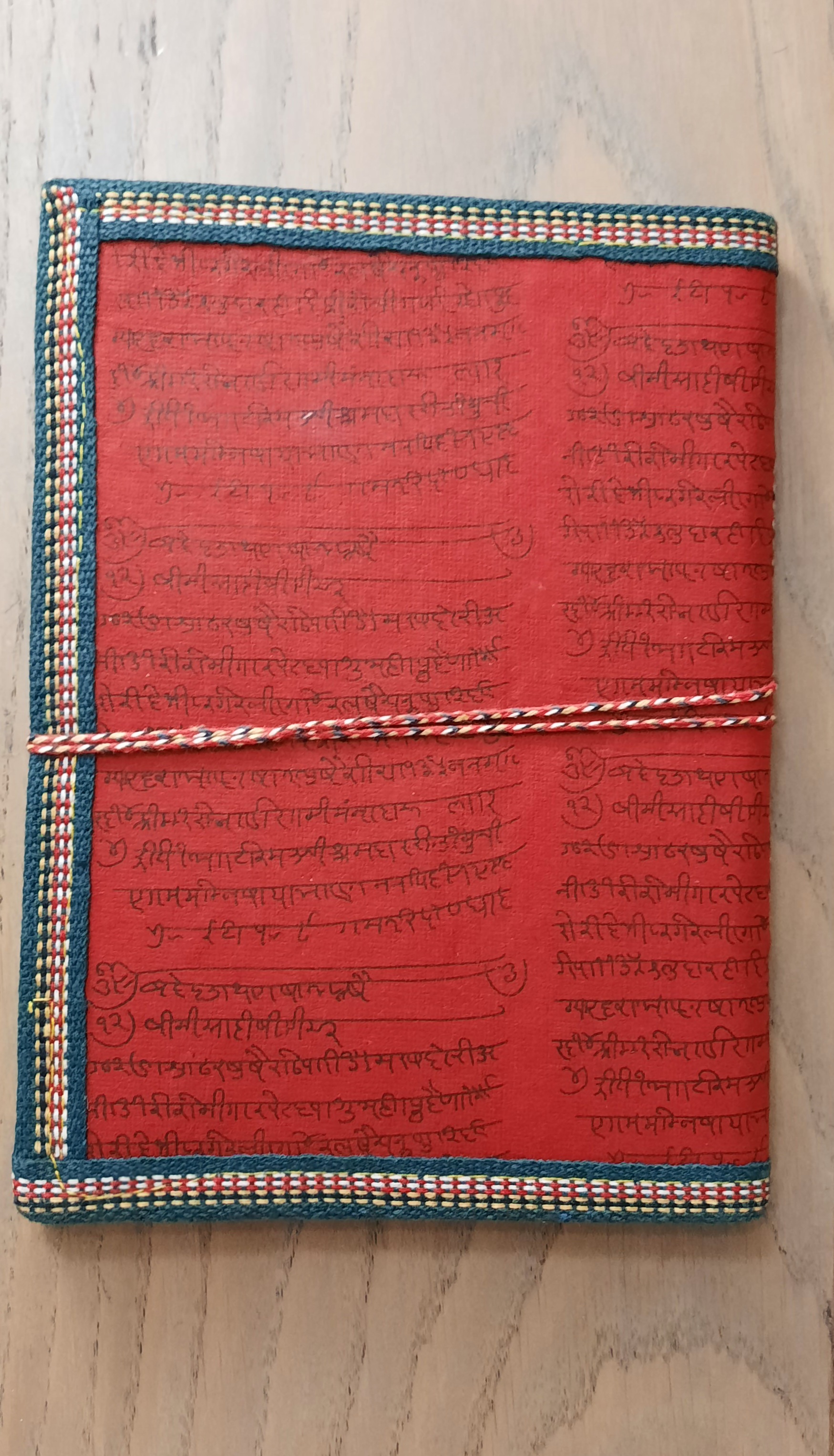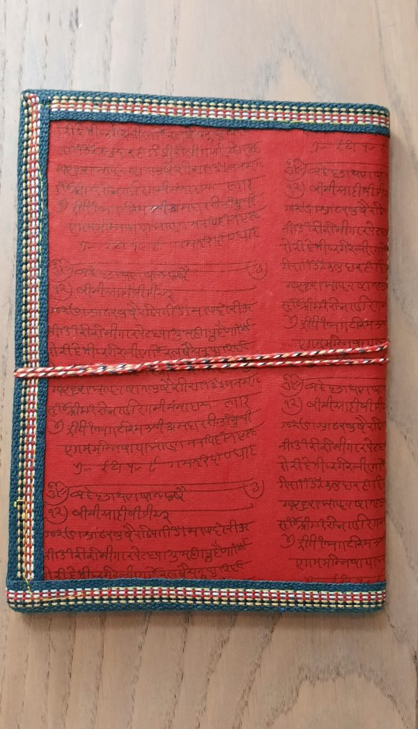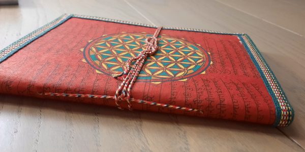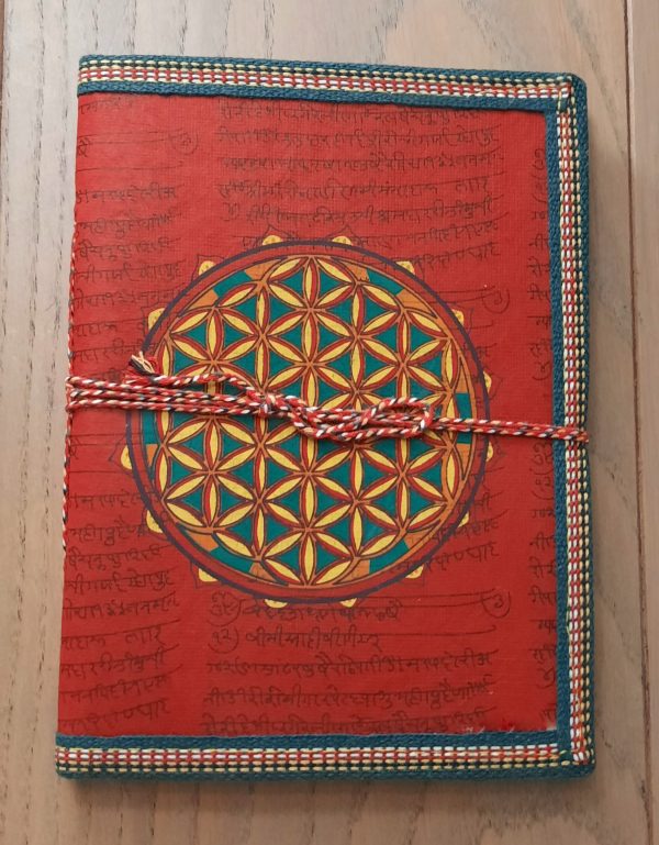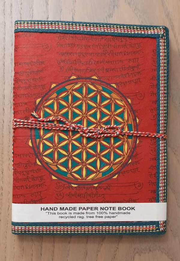 A handmade paper notebook with a beautiful mandala graphic on the front.